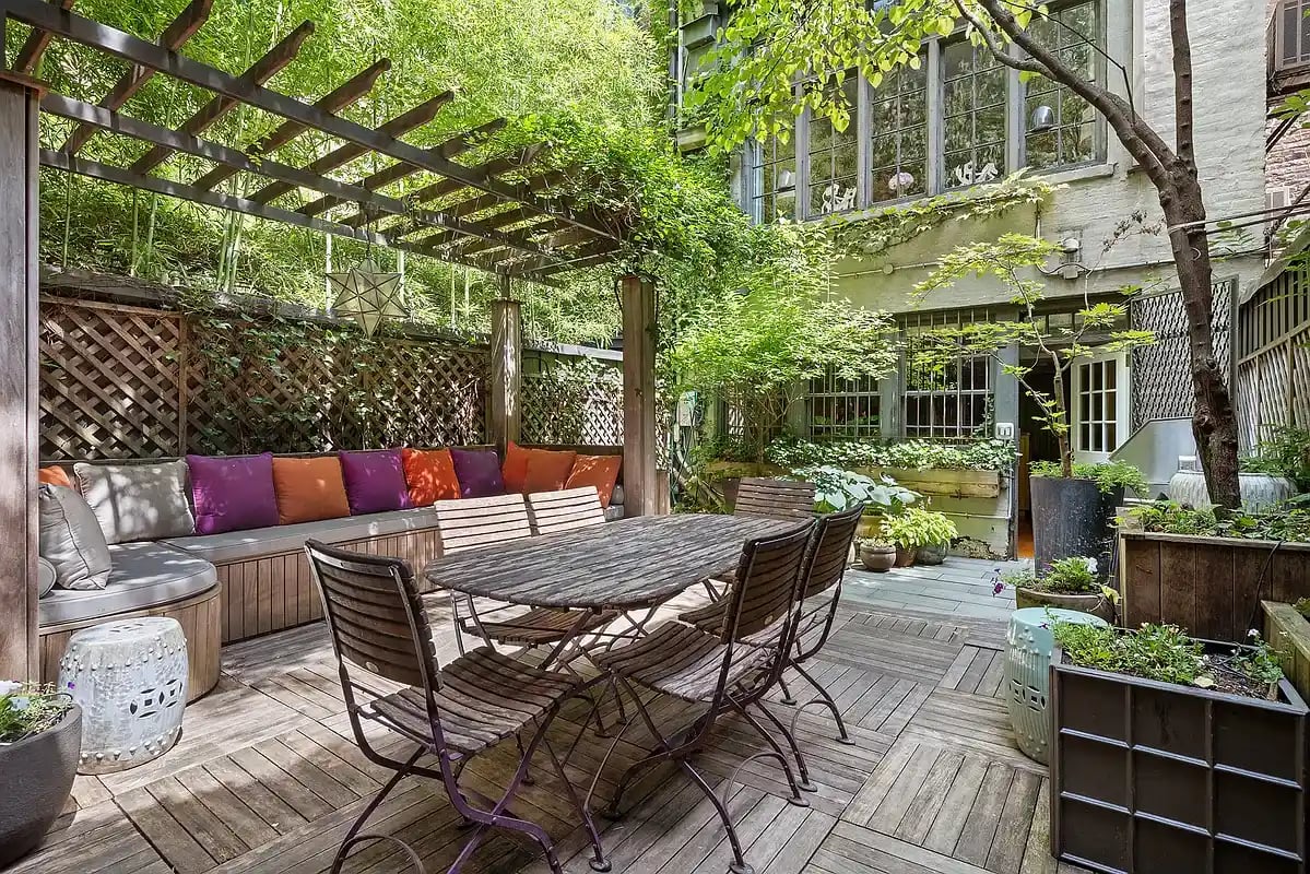 A gated entry and regal Italianate facade conceal spacious, sun-splashed interiors with three exposures (north, east, and south) and preserved original details like archways, hand-carved fireplace mantels, soaring ceilings, stained glass accents, and a dramatic winding staircase crowned with a skylight. In the garden, alfresco meals and intimate gatherings are set against a backdrop of lush greenery, flowering trees, and a choir of chirping birds.