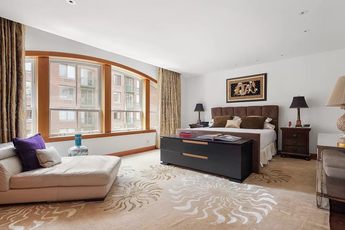 The third floor features a guest bedroom with an ensuite bathroom and private outdoor balcony, a space that feels like you are in a boutique hotel room in Paris. The fourth floor is dedicated to the primary suite, complete with an ensuite bathroom with a deep soaking tub, a walk-in closet, and an oversized arched window with electronic blackout shades. The fifth floor has three additional bedrooms, while the sixth penthouse floor is an informal entertainment room and the first floor of the duplex rooftop terrace.